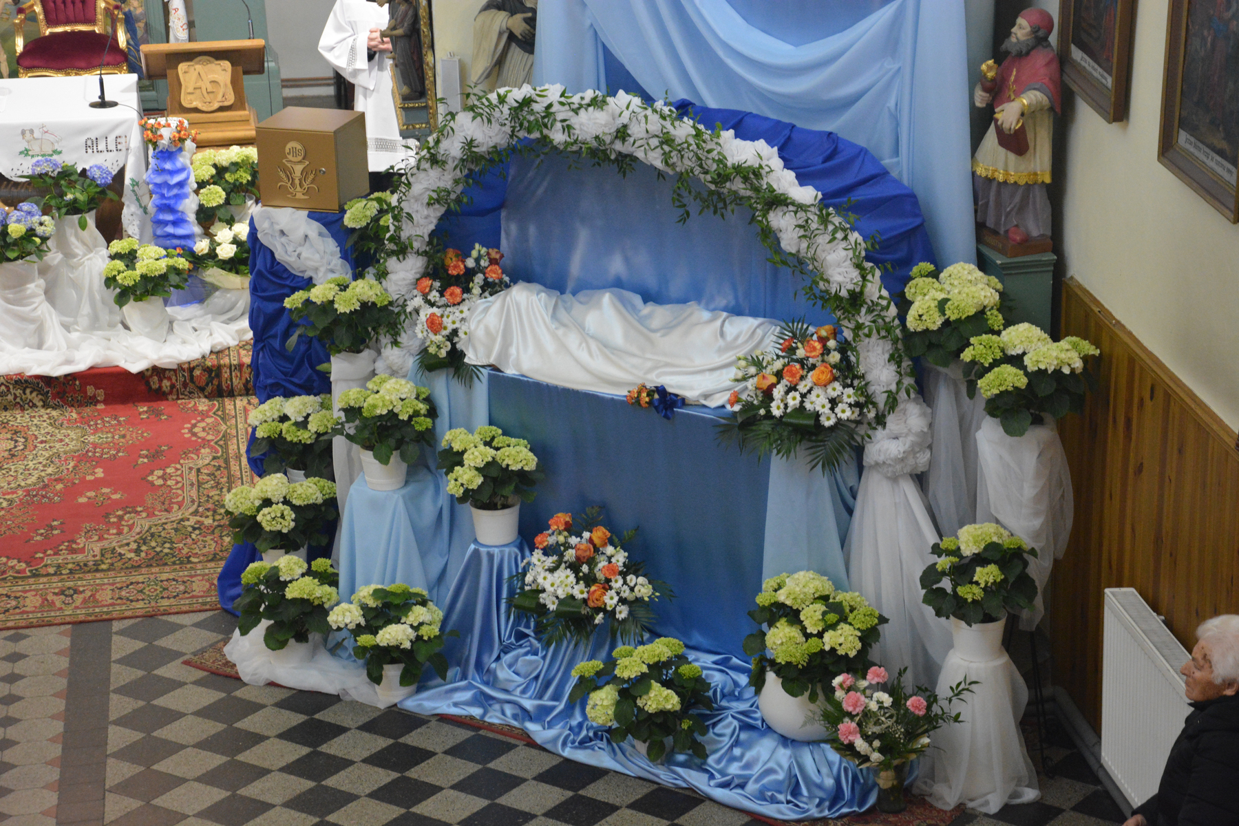 Na specjalnym tronie wystawia się Najświętszy Sakrament w monstrancji okrytej białym przejrzystym welonem - symbolem całunu.